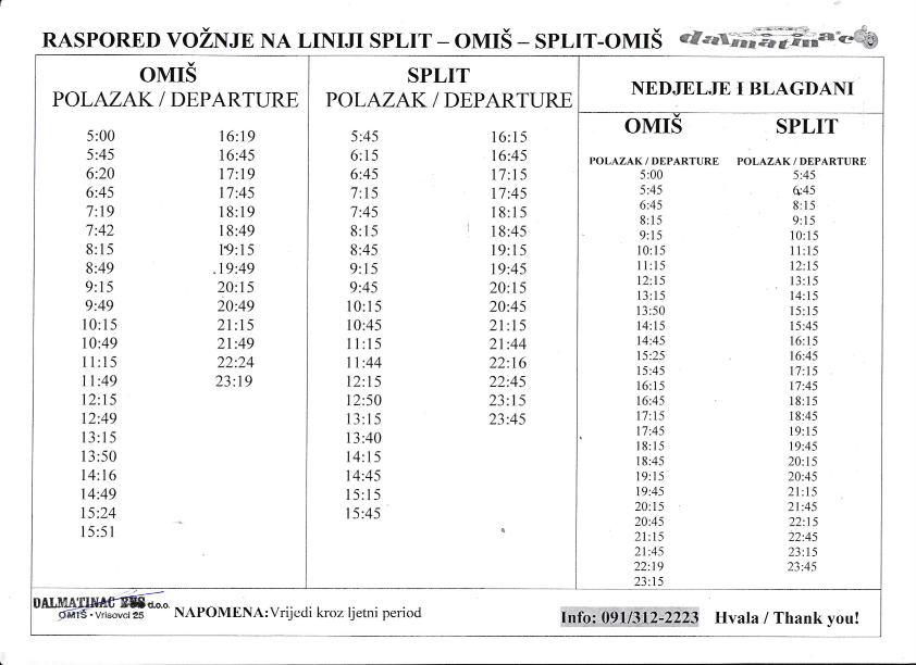 Raspored vožnje na liniji Omiš – Dugi Rat - Split (i nazad) našim javnim prijevoznikom, tvrtkom Dalmatinac, potražite na slici u nastavku članka.